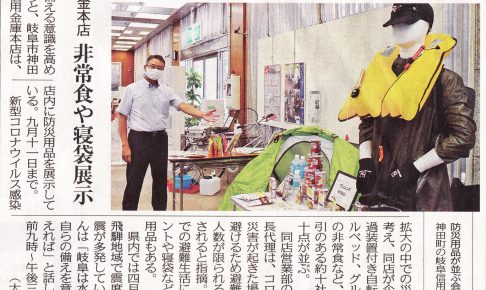 <コロナ禍 防災意識を高めよう 防災用品展示 @岐阜信用金庫本店> ●コロナ禍の中で災害が起きた場合に備えておきたいもの ●「3密」を防ぐ避難所はこんな感じになる? をテーマに ①備える→②逃げる→③生き延…
